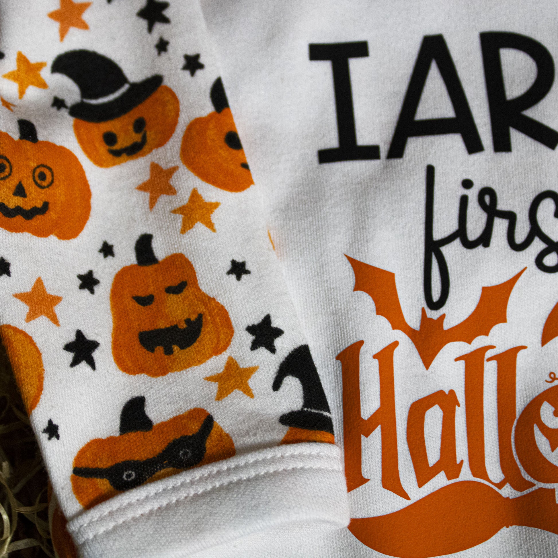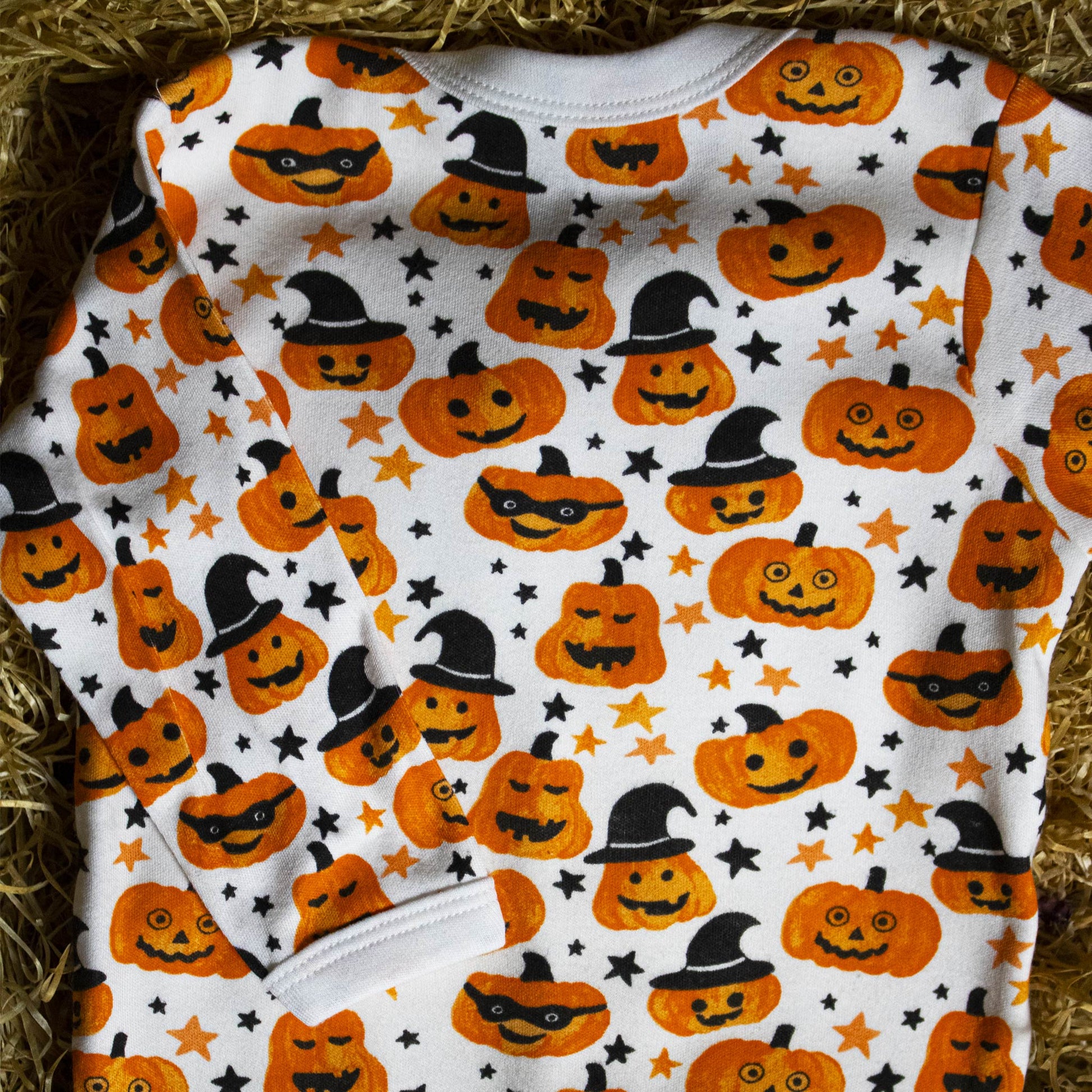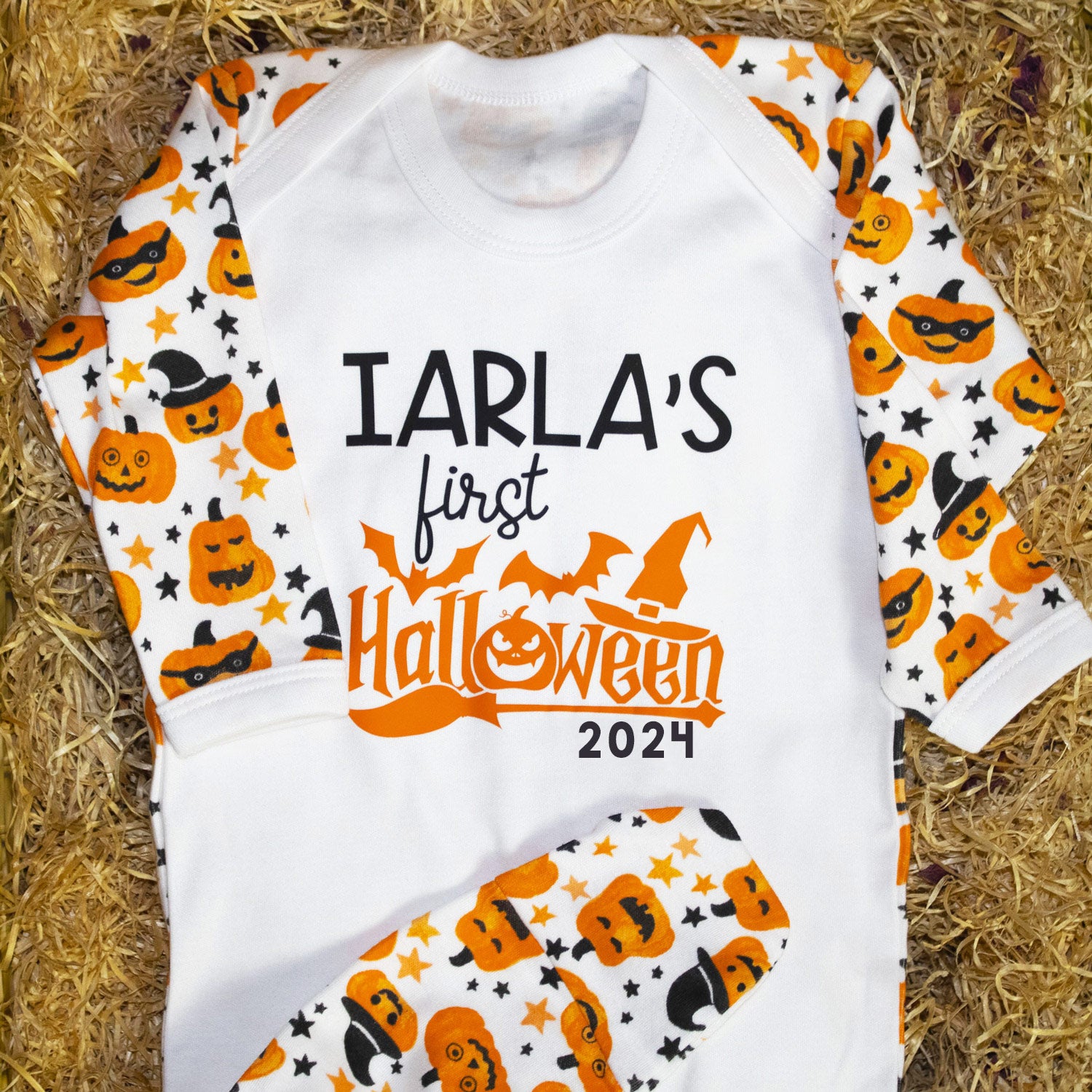 Dress your little one up for their first Halloween in this adorable, pumpkin print baby suit. The 100% cotton romper is soft and stretchy, perfect for a spooky night of trick or treating. Personalise this romper suit with a name and make memories that will last a lifetime with Babies' First Halloween Baby Grow!