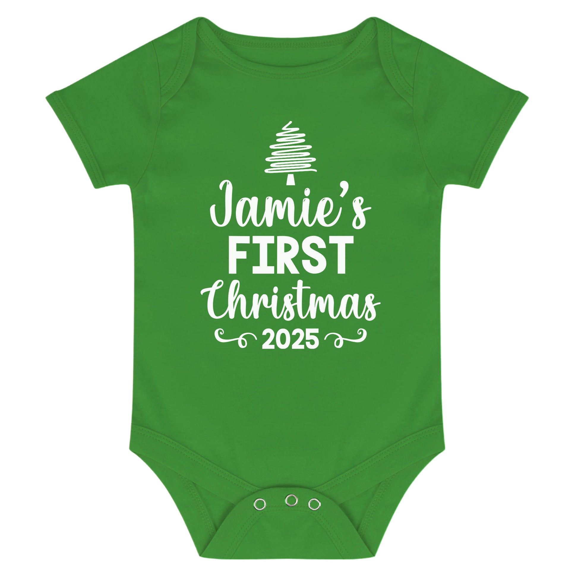 Welcome your little one's first Christmas with this unique green baby vest! Adorned with a festive Christmas tree design and personalised message, they will be the best-dressed little one at the holiday party. Ho ho ho!