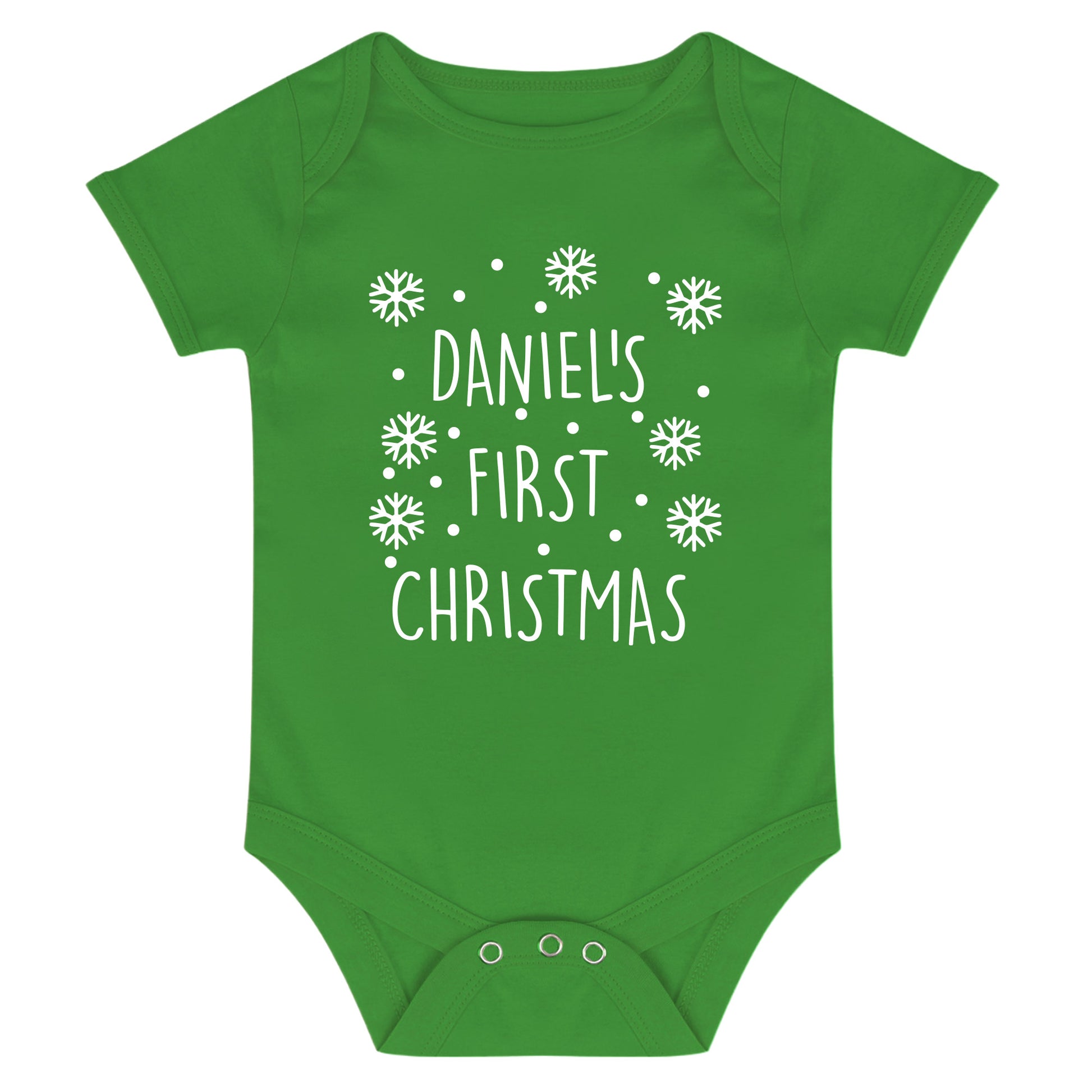 Let your baby be the talk of the town this Christmas in this super cute Personalised Baby Vest! With a festive green background and a white snowflake and snowdrop design, it's the perfect way to keep your little one snug and stylish this holiday season. Plus, it's personalised with their name for an extra special touch!