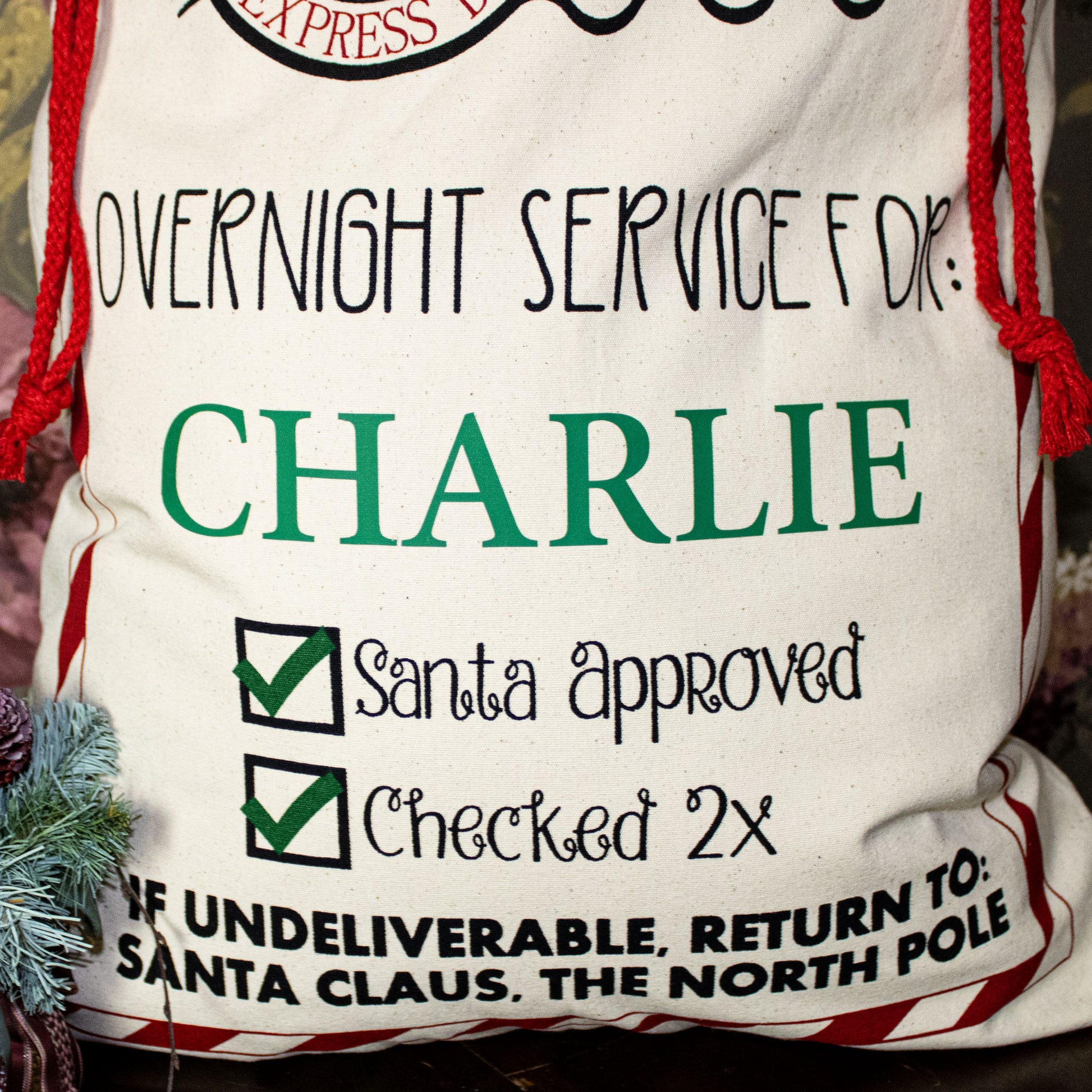 This festive Christmas sack is the perfect addition to your holiday celebrations. Personalised with a name, it features the "North Pole Express Delivery" logo, complete with Santa-approved checkboxes. Ideal for storing presents, treats, or as a charming decoration, it’s sure to make Christmas morning extra special!